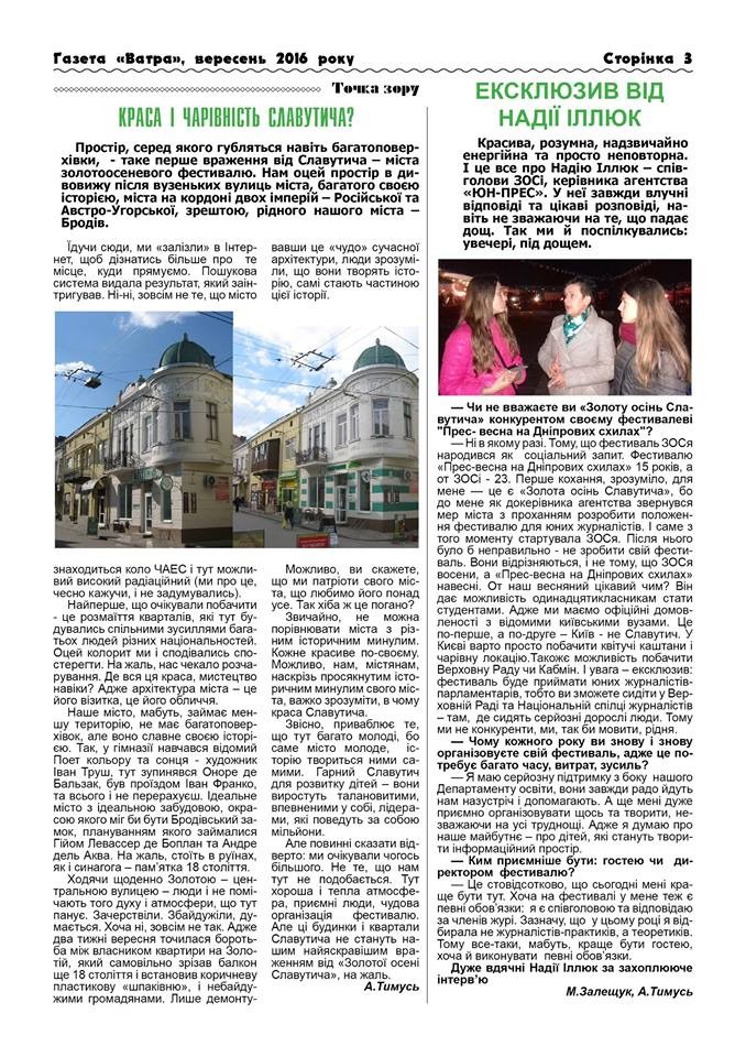 23-26 вересня 2016 року у м. Славутич, Київської області відбувся Міжнародний фестиваль дитячої демократії, телебачення, преси та творчості «Золота осінь Славутича – 2016», на якому І місце посіла команда юних журналістів Бродівської гімназії ім. І. Труша. Редактор Ірина Стрільчук та юні журналісти: Анастасія Тимусь та Марта Залещук – представили свій конкурсний номер газети «Ватра». Вітаємо!!!